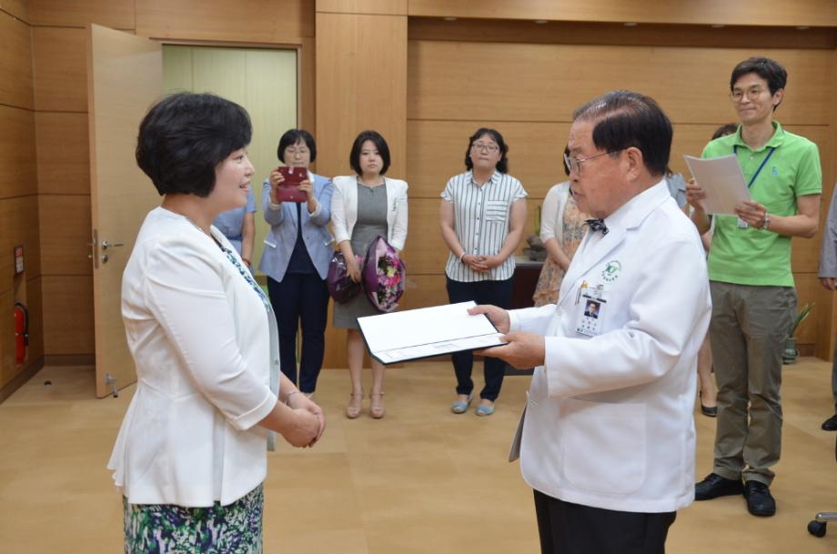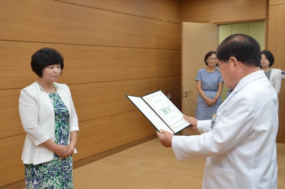 김희수 건양대학교 총장님께서 김미정 센터장님에게 위촉장을 수여하셨습니다.