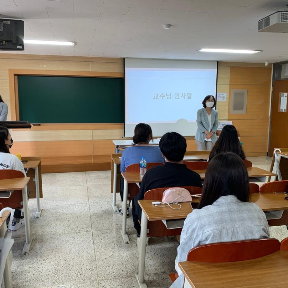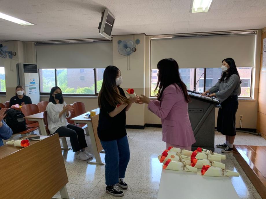 아동보육학과 학과 OT (성년의 날) ※ 보육교사 2급 자격증을 취득하기 위해서는 필수 과목은 8시간 이상 출석수업이 원칙임을 바탕으로 대면수업을 진행하였습니다. 6월3일 아동보육학과 성년의날 행사를 진행하였습니다. 1학년 아동음악 대면수업 중 교수님께서 시간을 내주셔서 점심시간을 활용하여 학과 OT를 진행하였습니다. 선배들의 축하하는 마음이 담겨진 직접 만든 꽃다발이 준비되었으며 각 지도 교수님께서 학생들 한명씩 꽃을 전달해주며 행사를 마무리하였습니다. 다시 한번 스무 살이 된 20학번 친구들 성년의 날 축하하며 언제나 응원합니다. ※ 전염병 확산 예방법에 따라 창문을 모두 열고, 모두 마스크를 착용하고 진행하였습니다. |