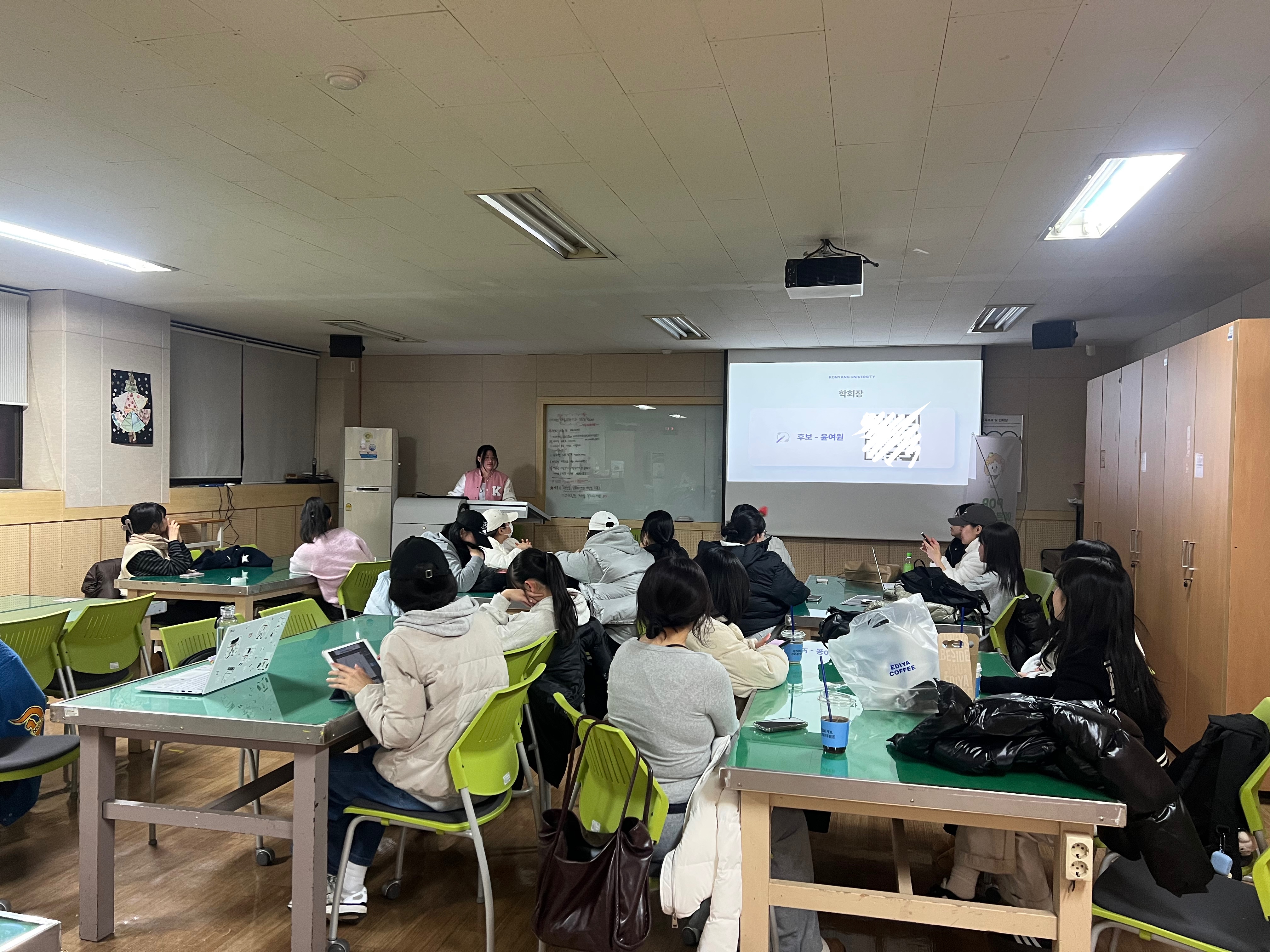 이번 종강총회에서는 교수님들의 인삿말, 2025학년도 임원 소개, 2학기 월별 행사 보고, 총무부의 학회비 보고, 대의원 감사보고, 2026학년도 새로운 학회장 소감 및 인삿말, 단체사진 촬영 순서로 진행을 하였습니다.
