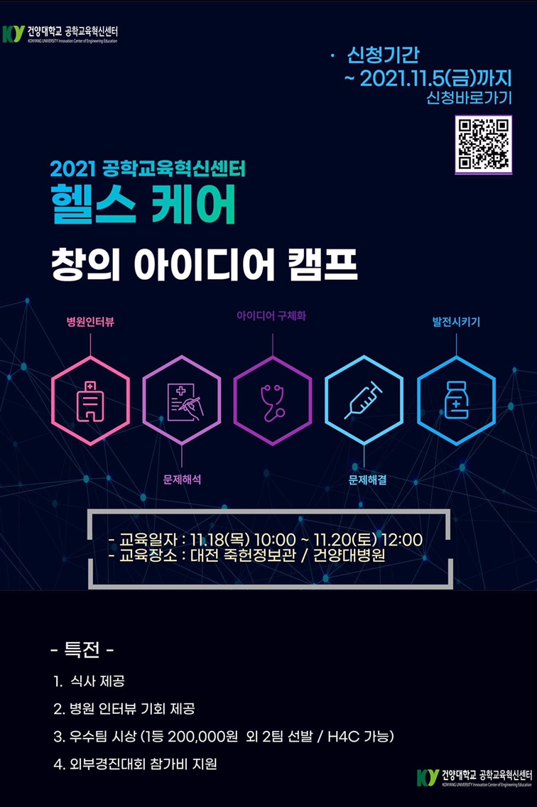 『 헬스케어 창의 아이디어 캠프 』글의 상세내용을 확인하는 표로 제목, 부서명, 등록일, 조회, 첨부, 내용으로 나뉘어 설명합니다.