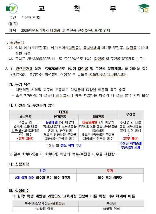 | 제목 | 2026학년도 1학기 다전공 및 부전공 신청(신규, 포기) 안내 | ||||