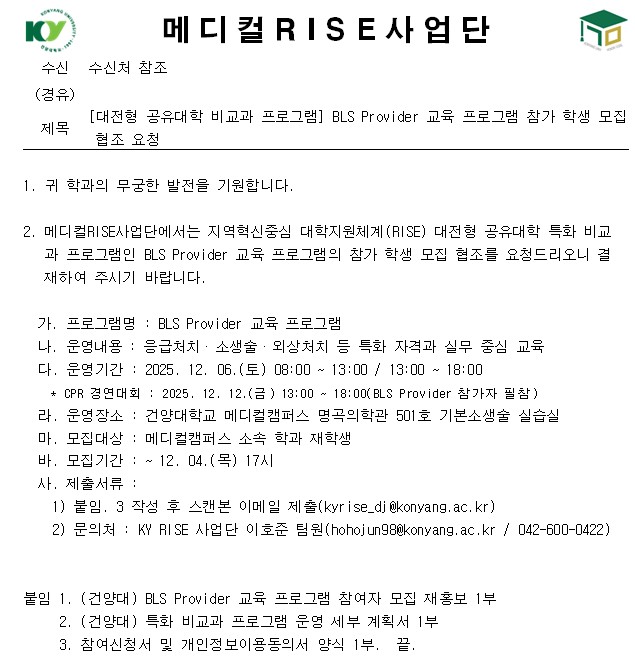 | 제목 | [대전형 공유대학 비교과 프로그램] BLS Providr 교육 프로그램 참가 학생 모집 협조 요청 | ||||