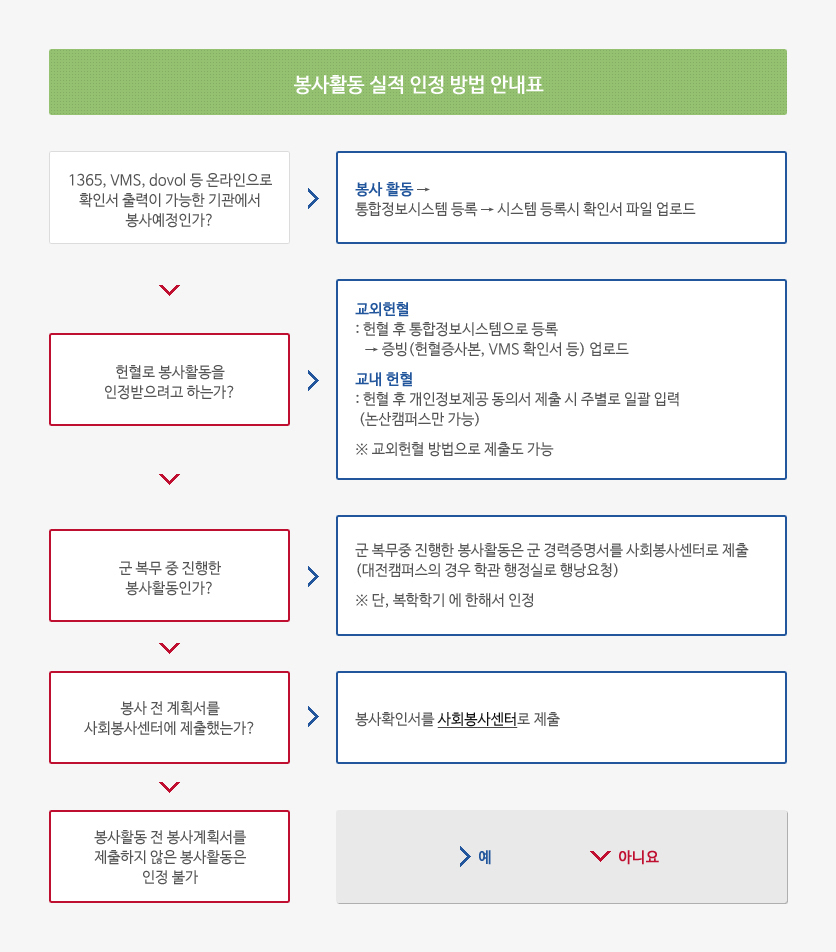 3. 사회봉사 인정 가. 일반봉사활동 - 1365, VMS, dovol 등 온라인으로 발급사실 조회가 되는 봉사실적의 경우 - 온라인으로 발급사실조회가 불가한 봉사실적은 봉사 전 활동계획서를 제출해야 - 단대·학과단위로 단체 외부봉사활동을 진행했을 경우 공문 등의 증빙 문서와 명단을 ※ 별도 학생 업로드 및 실적물 제출 불요 나. 헌혈봉사 - 학기 중 1회만 가능 (교외헌혈도 인정) - 혈장 헌혈 등 전혈이 아닌 헌혈도 인정 - 통합정보시스템에 등록 시 본인의 헌혈증이나 VMS 실적물을 업로드