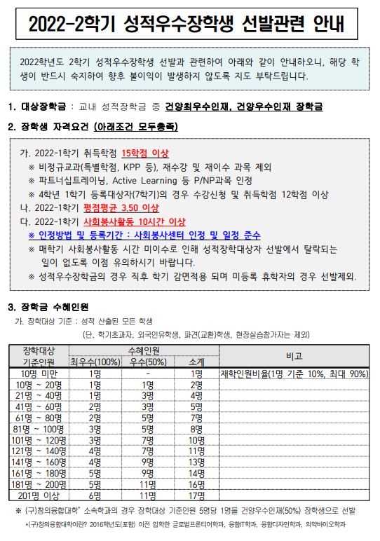 『 2022-2학기 성적우수장학생 선발관련 안내 』글의 상세내용을 확인하는 표로 제목, 부서명, 등록일, 조회, 첨부, 내용으로 나뉘어 설명합니다.