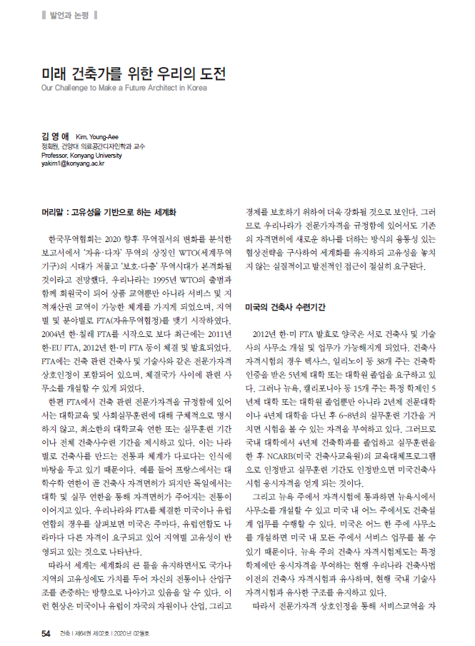 대한건축학회 2020년 2월 건축지에 발언과 논평 기고! 대한건축학회에서 4년제 건축관련학과 졸업생들의 건축사시험자격 부적합에 대한 제도 개선에 대해 나섰어요. 그 동안에는 우리학과 졸업생들이 건축사예비시험을 통해 건축사자격시험 응시가 가능하였으나, 2020 현재 대학원을 진학하여야 건축사자격시험이 가능하게 되었지요. 이에 이를 개선하고자 6월 대한건축학회 신임회장단에서는 건축사시험제도개선 특별위원회를 구성하여 4년제, 전문대 등 건축설계사무소로 진출하는 졸업생들의 건축사자격시험 기회를 마련하고자 활동을 시작했어요. 이에 대해 김영애 교수님이 건축학회지에 기고문을 실었습니다. 건축가를 꿈꾸는 학생들에게 시험자격을 주는 일, 그리고 우리 건축생태계를 유지해나가는 일에 대한 당위성을 잘 설명하고 있습니다. 건축가를 꿈꾸며, 한걸음 한걸음 작은 역량을 키워나가는 여러분, 함께 노력해서 만들어 갑시다.