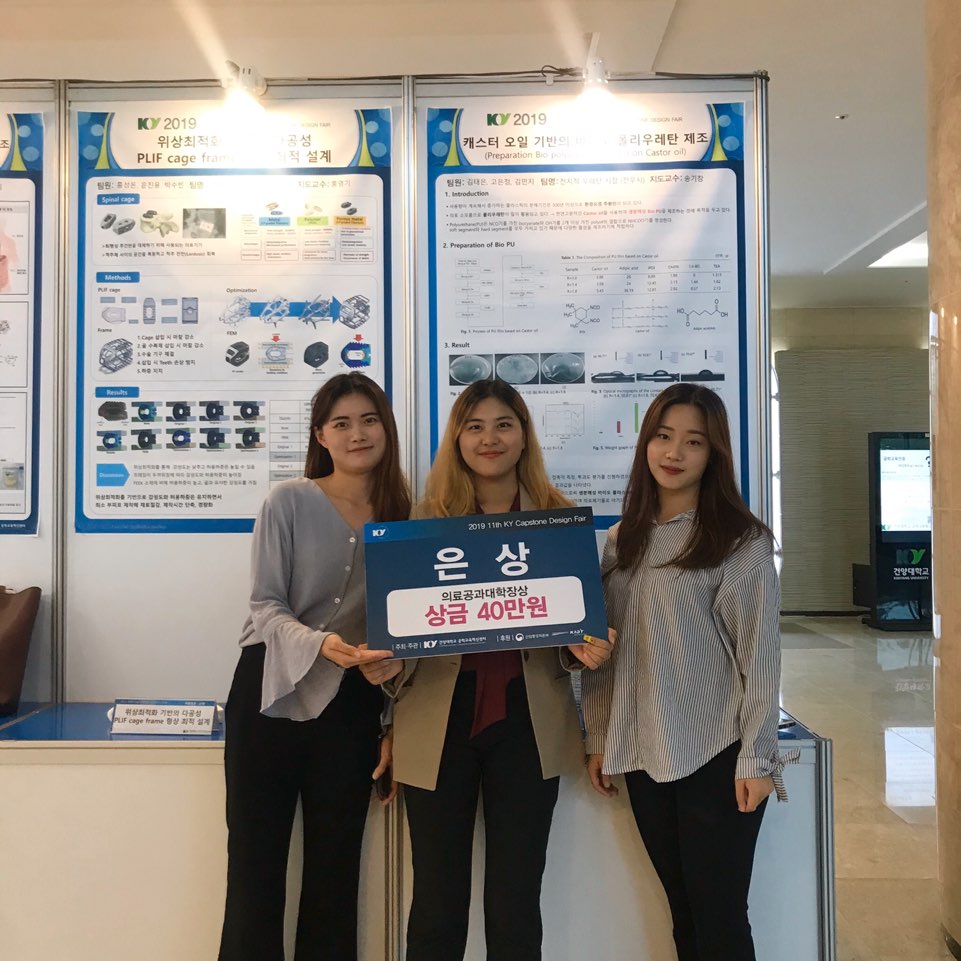 우리 의료신소재학과 3학년에 재학 중인 김종현,김남호,박민규 학생팀과 고은정, 김민지, 김태은 학생팀이 각각 금상과 은상을 수상하였습니다. 또한 4학년에 재학 중인 홍성돈 학생은 학생포트폴리오 경진대회에서 금상을 수상하였습니다. 축하드립니다^^ [관련 세부 정보] -행사명 : 2019 캡스톤디자인 & 학생포트폴리오 경진대회 -일시 : 2019.09.26 -장소 : 건양대학교 죽헌정보관 -수상내역: 김종현, 김남호 박민규 - 금상(주제: 소수성 연성 인공수정체) 고은정, 김민지, 김태은 - 은상(주제: 캐스터 오일 기반의 바이오 폴리우레탄 제조) 홍성돈 - 금상( 학생포트폴리오 경진대회)