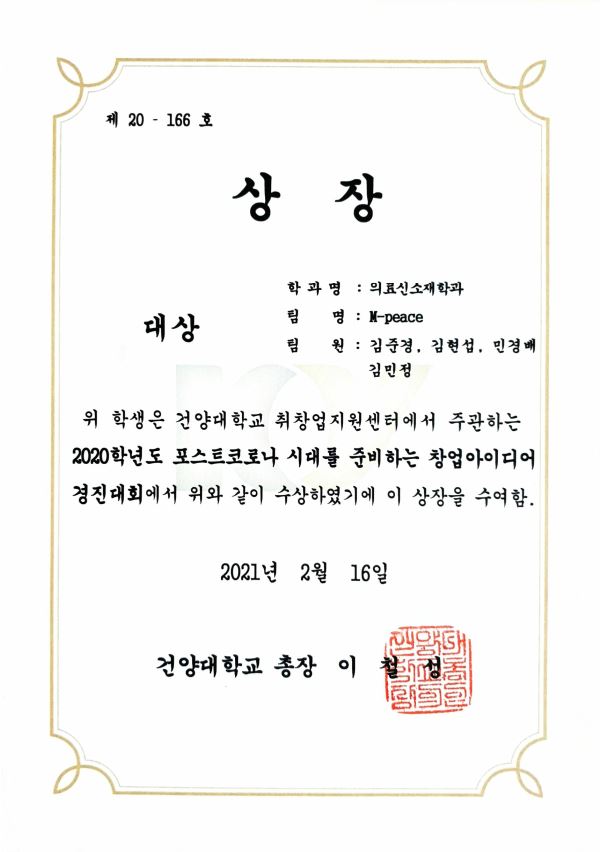 의료신소재학과 4학년에 재학 중인 김준경 학생과 3학년의 김현섭, 민경배, 김민정 학생이 대상을 수상하였습니다. 뿐만 아니라 , 4학년의 이상은, 최재환, 장세윤 학생이 격려상을 수상하였습니다. [관련 세부 정보] - 행사명 : 2020학년도 포스트코로나 시대를 준비하는 창업아이디어 경진대회 일시 : 2021.02.05 장소 : 건양대학교 ( 비대면 발표 ) 수상자 : 김준경, 이상은. 장세윤, 최재환, 김현섭, 민경배, 김민정 수상 내역 : 대상, 격려상 관련 기사 : http://www.newsband.kr/news/articleView.html?idxno=339620