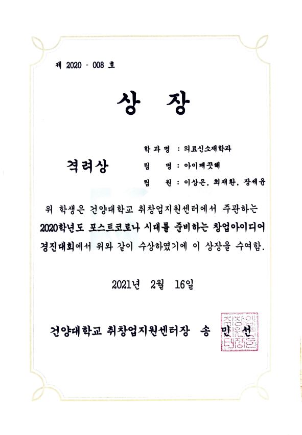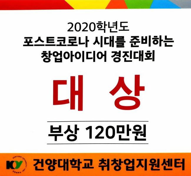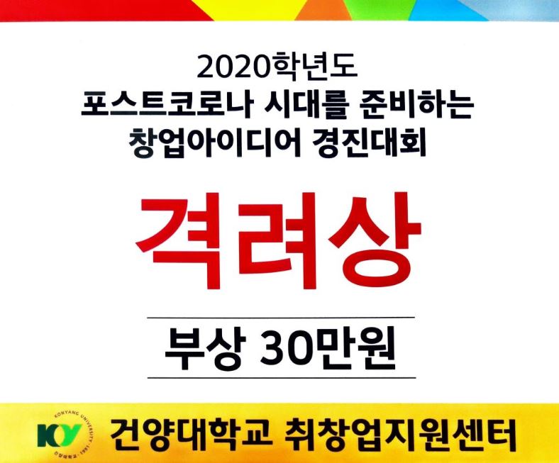 | 제목 | [수상] 2020학년도 포스트코로나 시대를 준비하는 창업아이디어 경진대회 – 대상, 격려상 | ||||