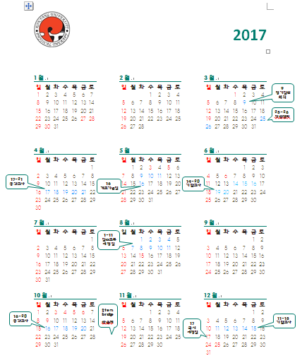 『 연간행사표 』글의 상세내용을 확인하는 표로 제목, 부서명, 등록일, 조회, 첨부, 내용으로 나뉘어 설명합니다.