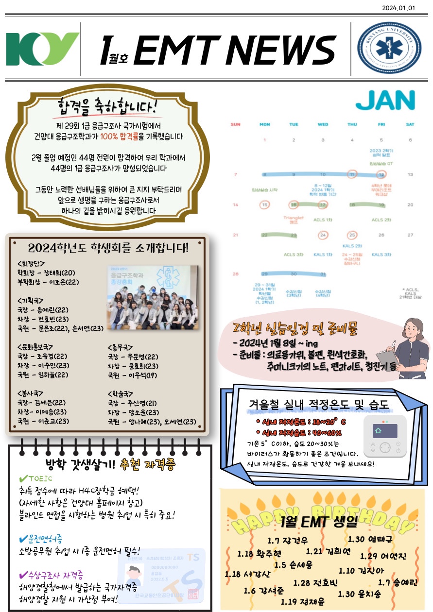 『 2024년도 1월 EMT NEWS 』글의 상세내용을 확인하는 표로 제목, 부서명, 등록일, 조회, 첨부, 내용으로 나뉘어 설명합니다.