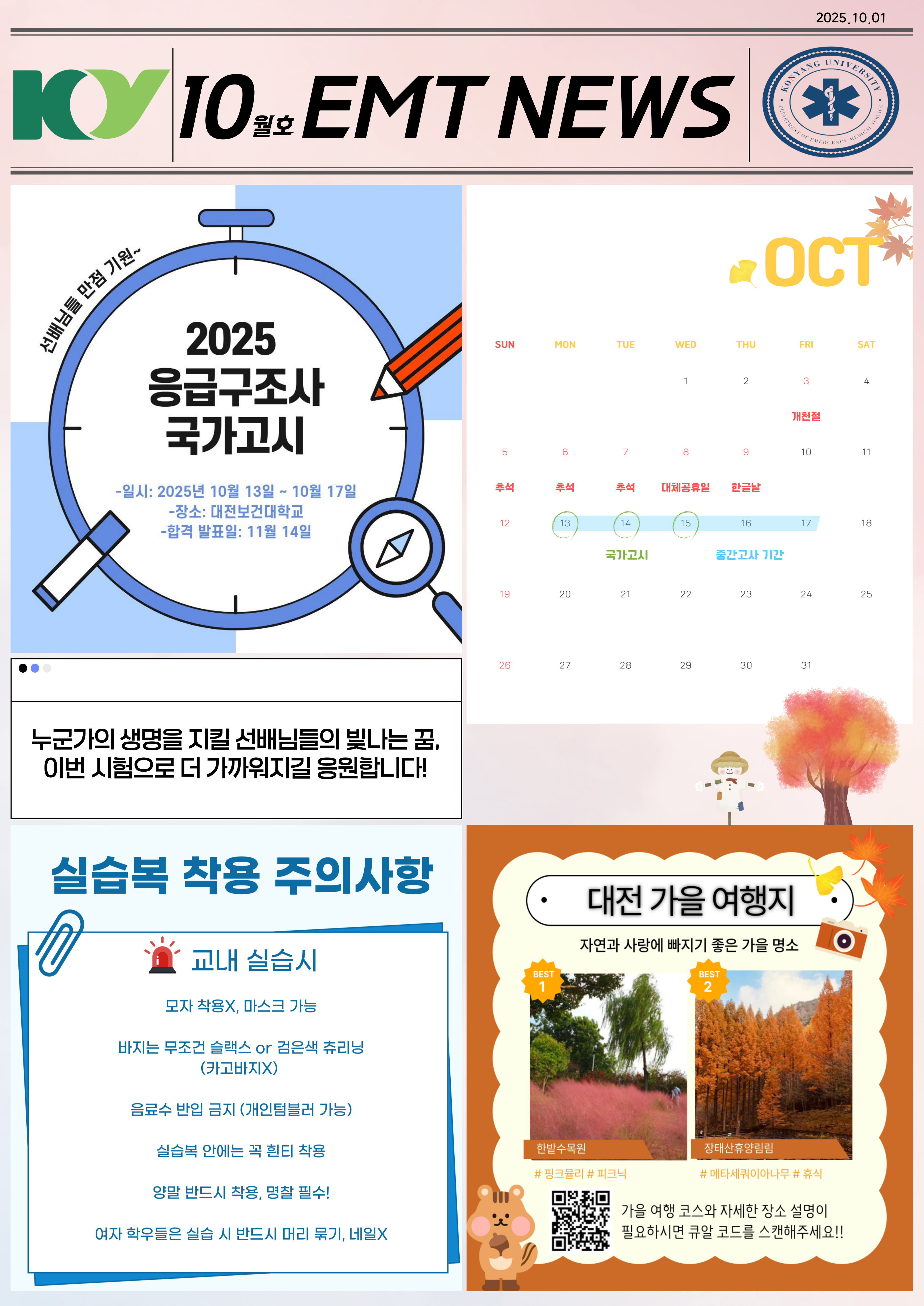 『 2025년도 10월 EMT NEWS 』글의 상세내용을 확인하는 표로 제목, 부서명, 등록일, 조회, 첨부, 내용으로 나뉘어 설명합니다.