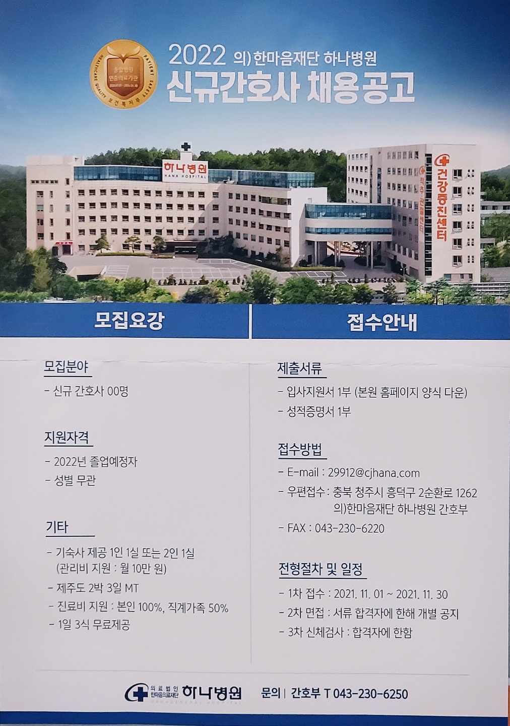 - 접수기간 : 11.01(월) ~ 11.30(화) - 접수방법 : 이메일, 우편, 팩스 ☎ 문의 : 간호부 043-230-6250