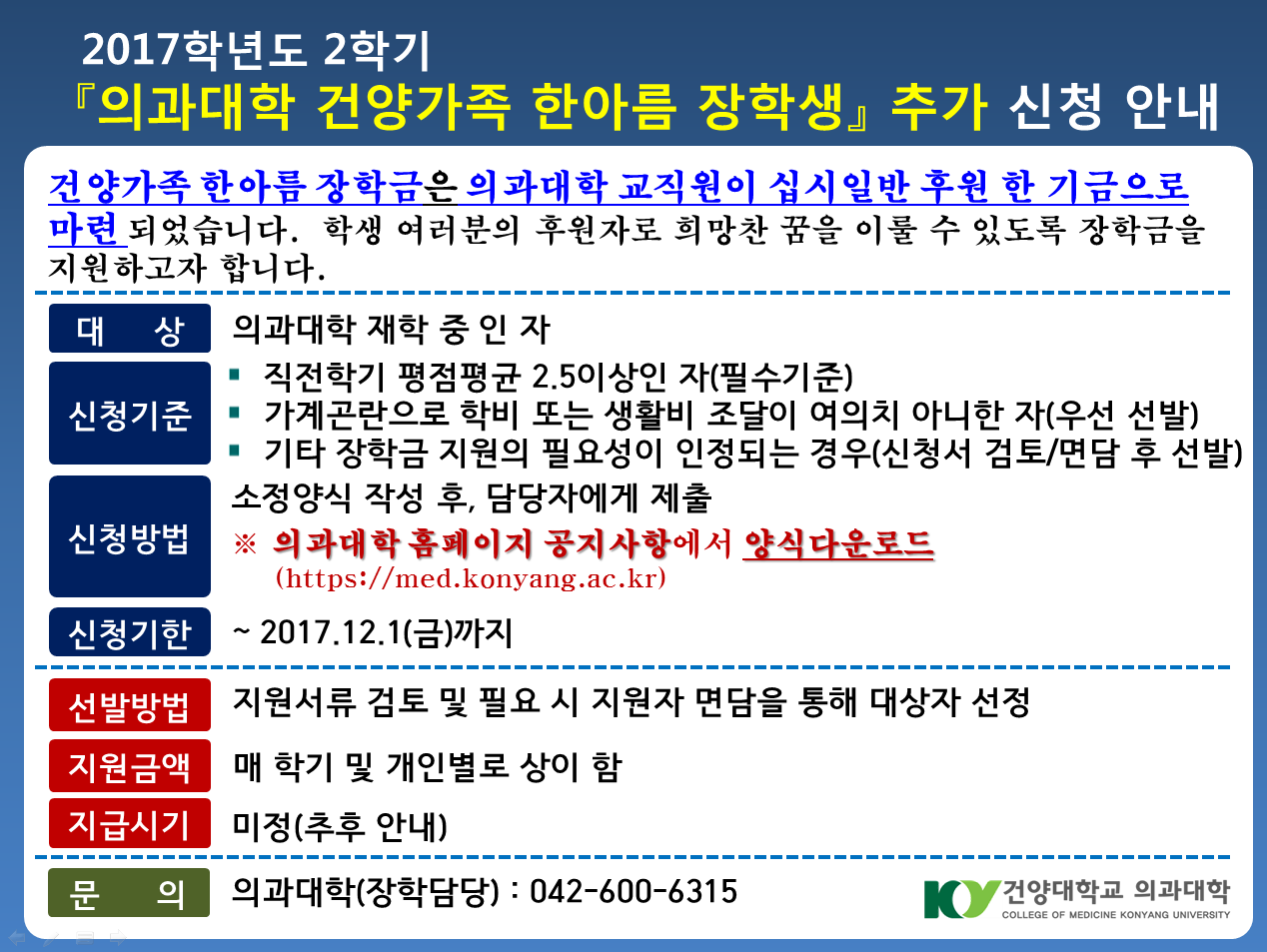 | 제목 | [추가 신청]2017학년도 2학기 「의과대학 건양가족 한아름 장학생」 추가 신청 안내 | ||||