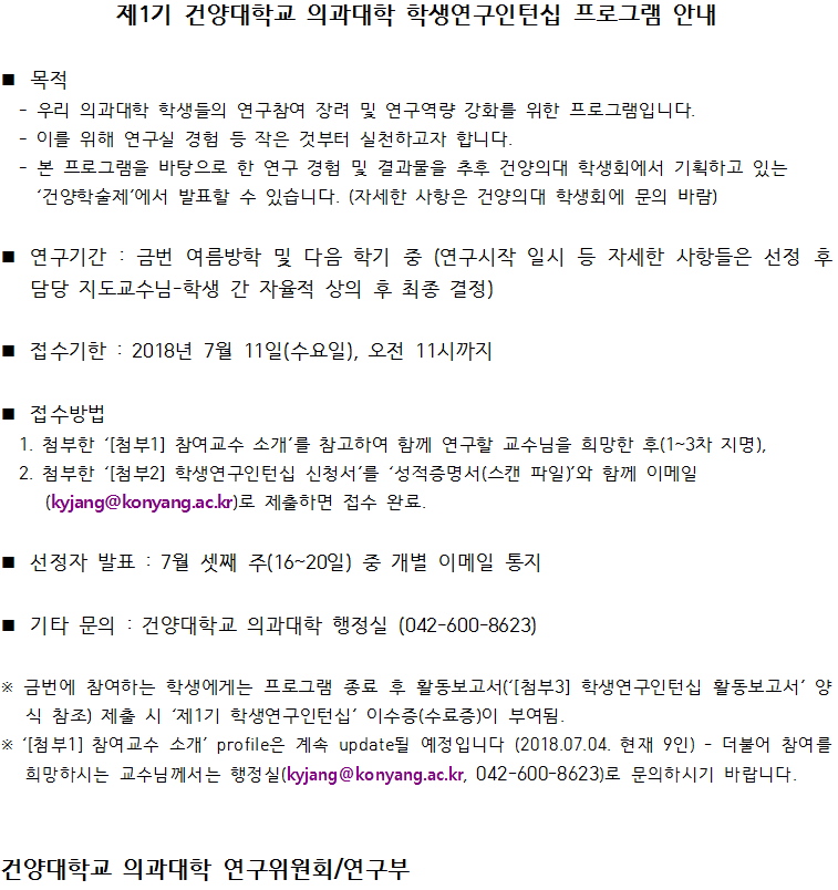 | 제목 | 제1기 건양대학교 의과대학 학생연구인턴십 프로그램 안내 | ||||