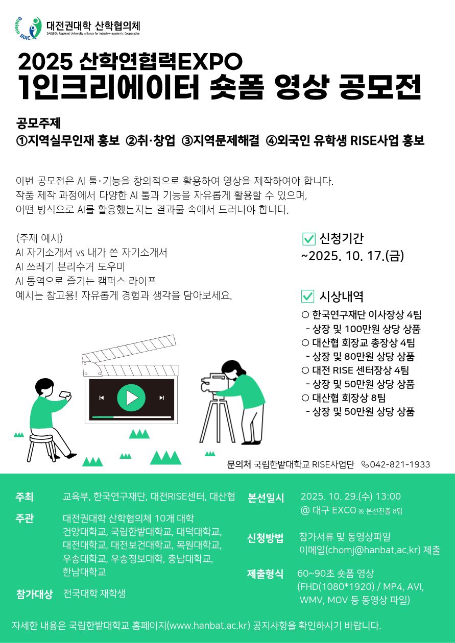 | 제목 | 2025 산학연협력 EXPO 1인 크리에이터 숏폼 영상 공모전 참여 안내 | ||||