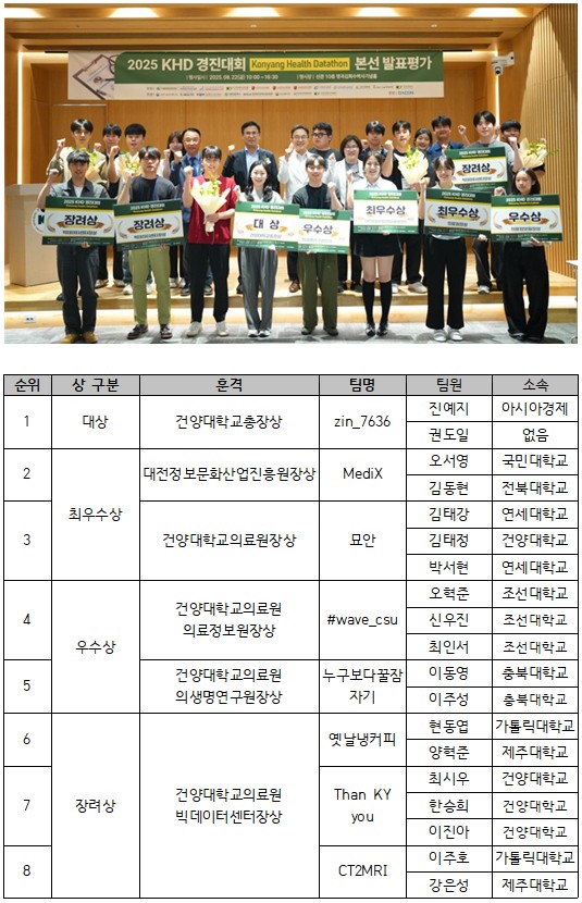 건양대의료원(의료원장 배장호)이 주최한 ‘2025 건양 헬스 데이터톤(KHD;Konyang Health Datathon) 경진대회’가 성황리에 마무리됐다.