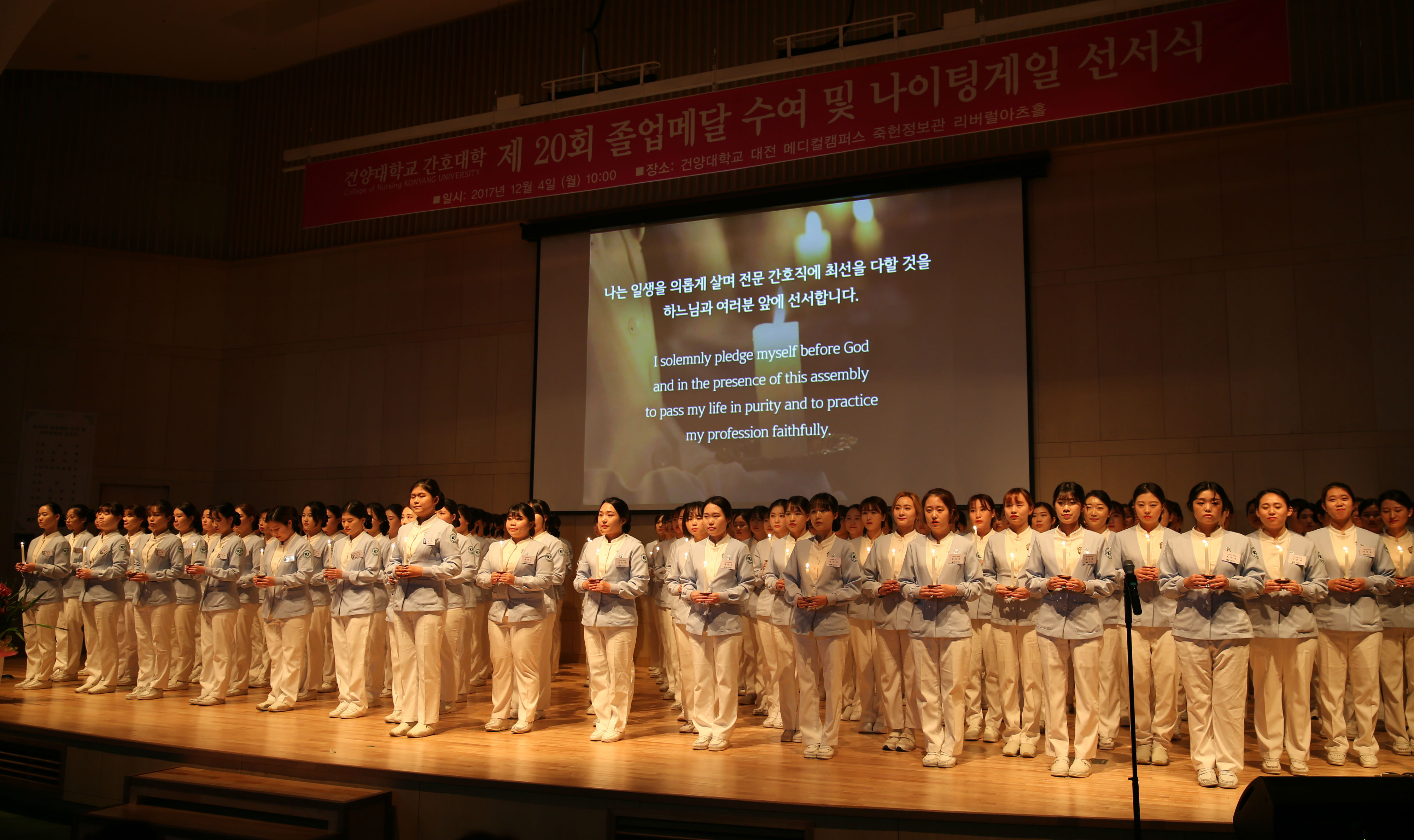 내년 2월 졸업을 앞둔 간호대학 4학년 학생 195명은 이날 졸업메달을 수여받는 동시에 스승으로부터 촛불을 이어받는 의식을 치르며, 나이팅게일의 희생과 숭고한 정신을 본받아 의료전문가로 헌신할 것을 다짐했다.