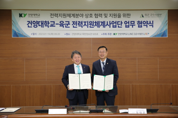 건양대학교(총장 김용하)는 19일 건양대 메디컬캠퍼스 죽헌정보관에서 육군 전력지원체계사업단(단장 정대건)과 육군 전력지원체계 분야의 전문인력 네트워크 구축 및 정보 교류, 산학협력 육성사업의 추진을 위한 프로그램 개발 및 운영에 대한 협력, 연구 개발과 기술 자문 지원 등 전력지원체계 발전 및 상호 협력을 골자로 하는 업무협약을 체결했다.