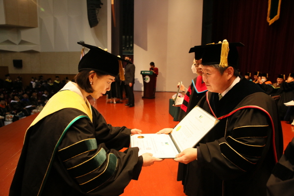 16일 오후 진행된 건양대 제29회 전기학위수여식에서 학위자에게 학위증을 수여하는 김용하 총장.JPG