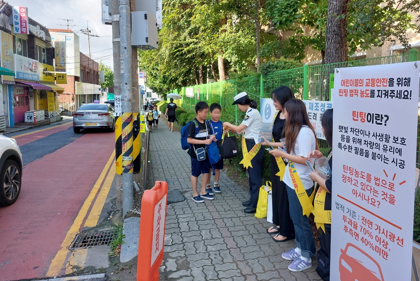 오전 내동초등학교 앞에서 서부경찰서 경찰관들과 함께 등교시간에 교통지도에 나선 학생들은 ‘어린이들의 교통안전을 위해 자동차 틴팅 법적 농도를 지켜주세요’라는