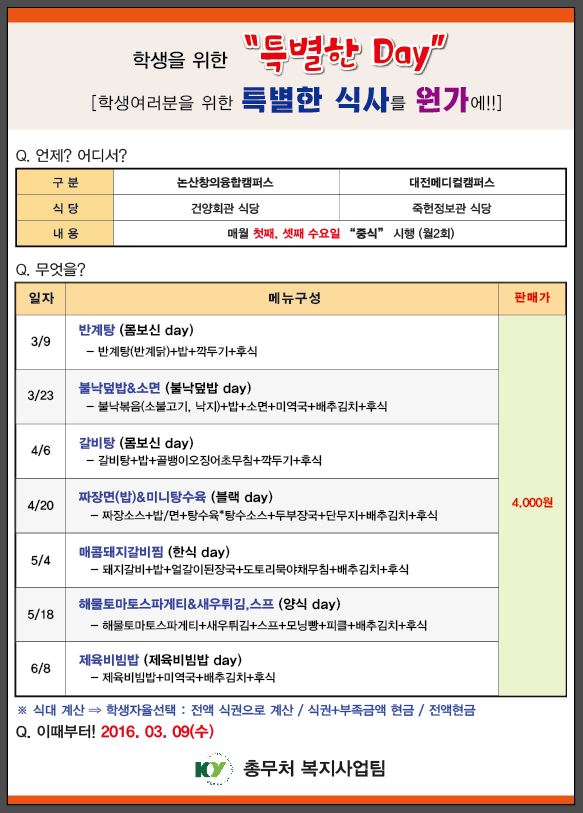 | 제목 | 대전/논산 학생식당 특별식 시행안내 | ||||