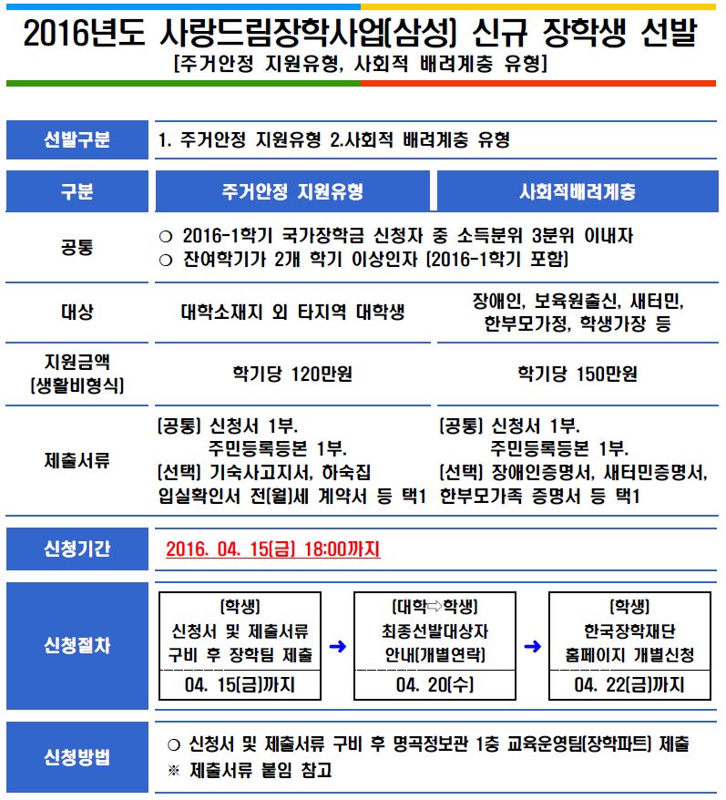 | 제목 | 2016학년도 사랑드림(삼성) 신규 장학생 선발공고 | ||||