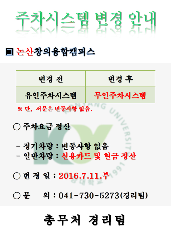 | 제목 | 논산 창의융합캠퍼스 주차시스템 변경 안내 | ||||