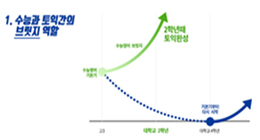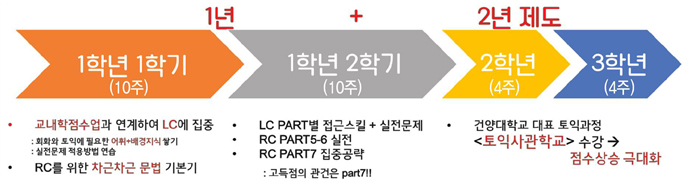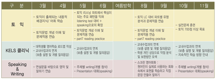1년+2개 학기 과정 | 1학년 1년간 영어에 대한 기본기 확립 후 2,3학년에 집중몰입과정을 통하여 취업에 필요한 토익 및 스피킹 스펙 향상 |