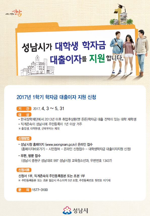 | 제목 | 2017학년도 1학기 성남시 학자금 대출이자 지원 신청 안내 | ||||