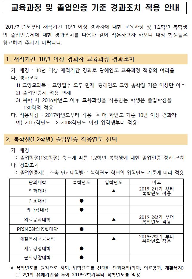 | 제목 | 교육과정 및 졸업인증 기준 경과조치 적용 안내 | ||||