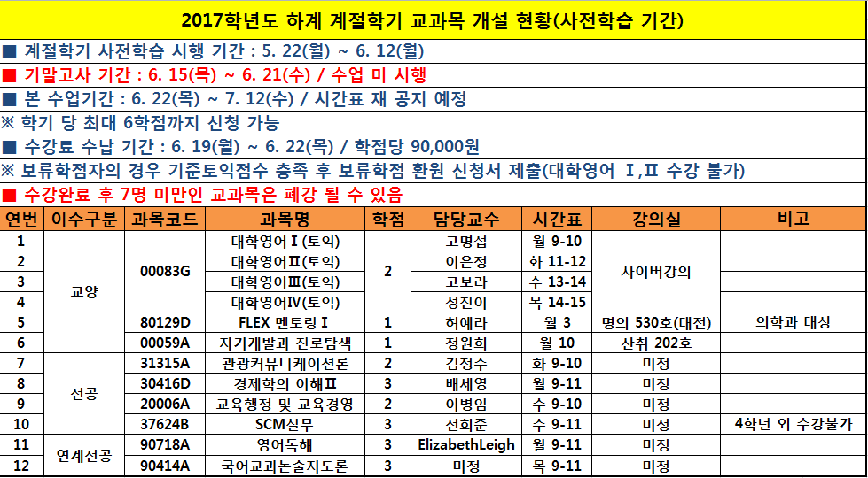 | 제목 | 2017학년도 하계 계절학기 교과목 개설 공고 | ||||