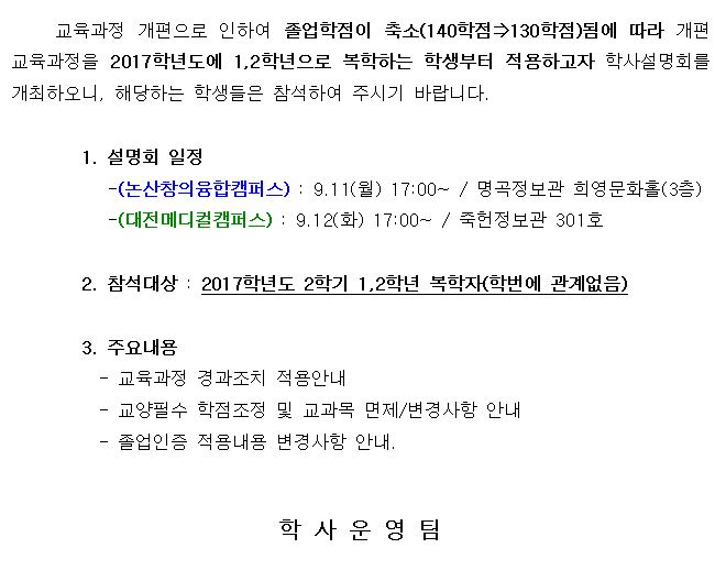 | 제목 | 2017학년도 2학기 복학생(1,2학년) 학사설명회 개최 안내 | ||||