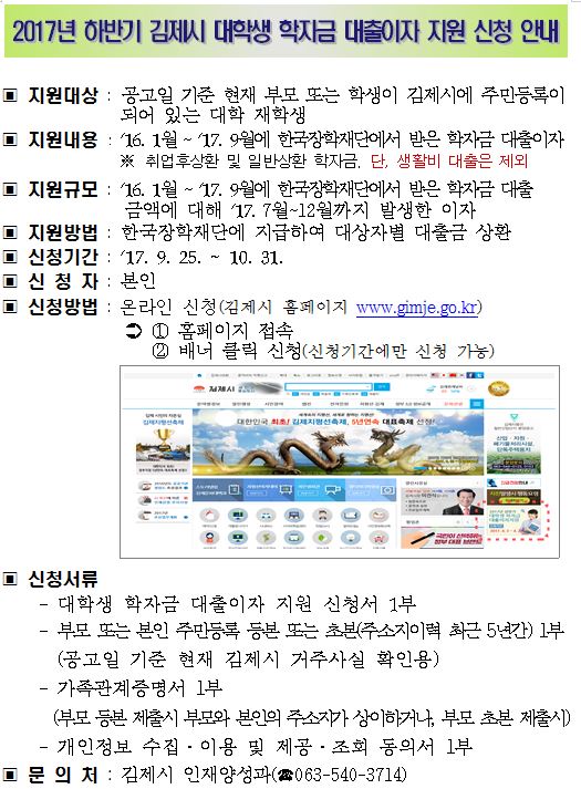 | 제목 | 2017학년도 하반기 김제시 대학생 학자금 대출이자 지원 신청 안내 | ||||