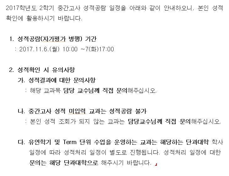 | 제목 | 2017학년도 2학기 중간고사 성적공람 일정 안내 | ||||