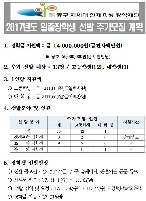 | 제목 | 2017학년도 (재)동구 차세대인재육성장학재단 일출장학생 선발공고 | ||||