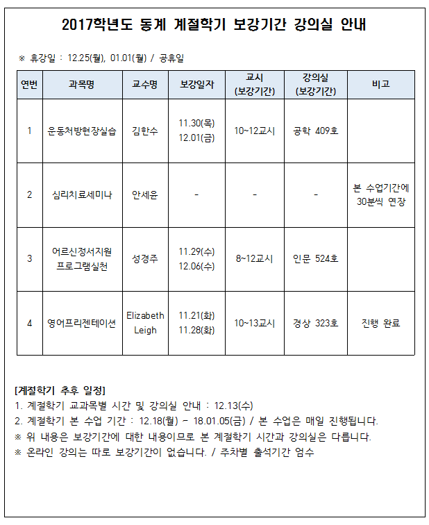 | 제목 | 2017학년도 동계 계절학기 보강기간 강의실 안내 | ||||