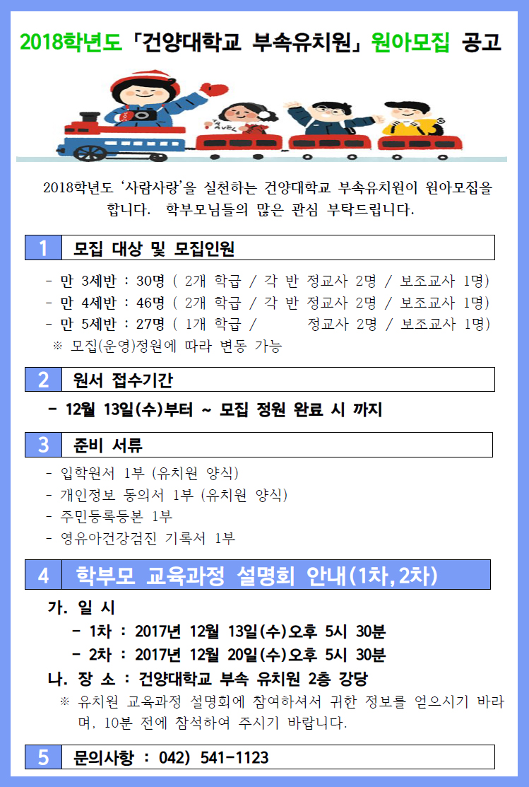 | 제목 | 2018학년도 건양대학교 부속유치원 원아모집 안내 | ||||