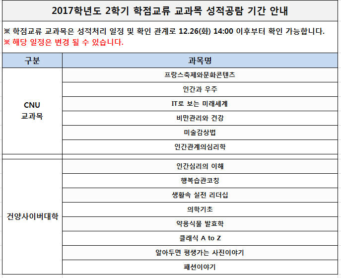 ※ CNU 교과목의 경우 CNU 측에서 조회되는 성적이 본인의 성적입니다. ※ 건양사이버대학 교과목의 경우 건양대학교 성적공람기간에 성적을 공람해야하며, |