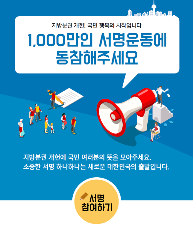 『 지방분권 개헌 1,000만인 서명운동 안내 』글의 상세내용을 확인하는 표로 제목, 부서명, 등록일, 조회, 첨부, 내용으로 나뉘어 설명합니다.