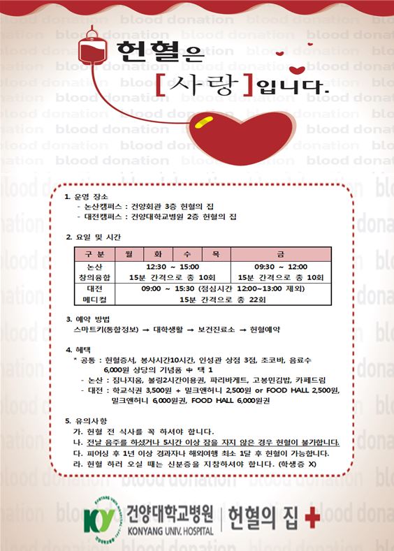 | 제목 | 논산/대전캠퍼스 헌혈의 집 운영 안내 | ||||