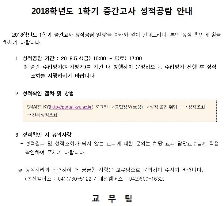 | 제목 | 2018학년도 1학기 중간고사 성적공람 안내 | ||||