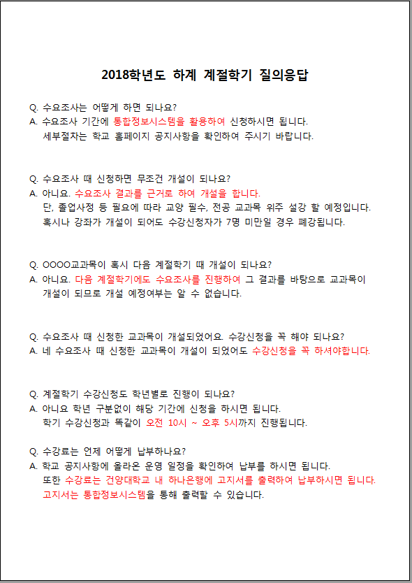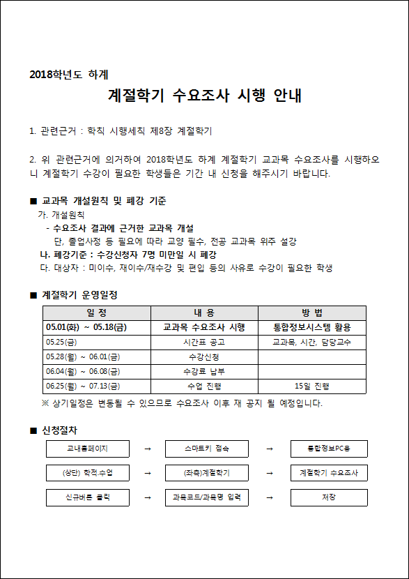 | 제목 | 2018학년도 하계 계절학기 수요조사 시행 안내 및 질의응답 | ||||
