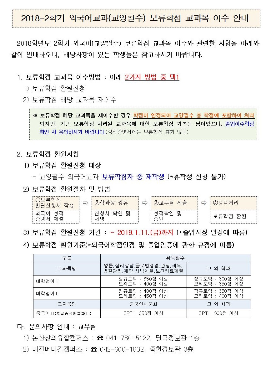 | 제목 | 2018학년도 2학기 외국어교과(교양필수) 보류학점 교과목 이수 안내 | ||||