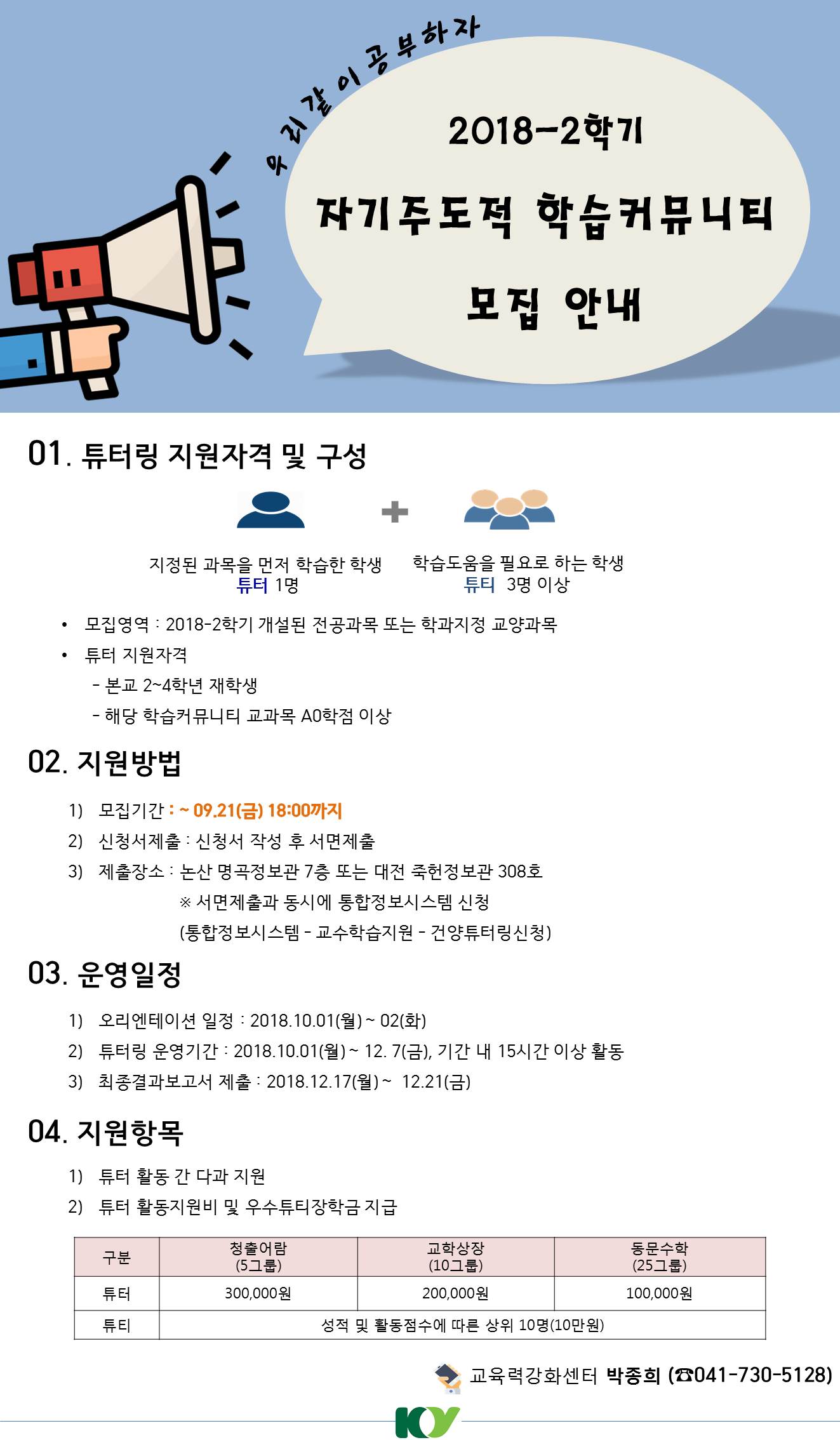 | 제목 | 2018-2학기 자기주도적학습커뮤니티(튜터링)모집 안내 | ||||