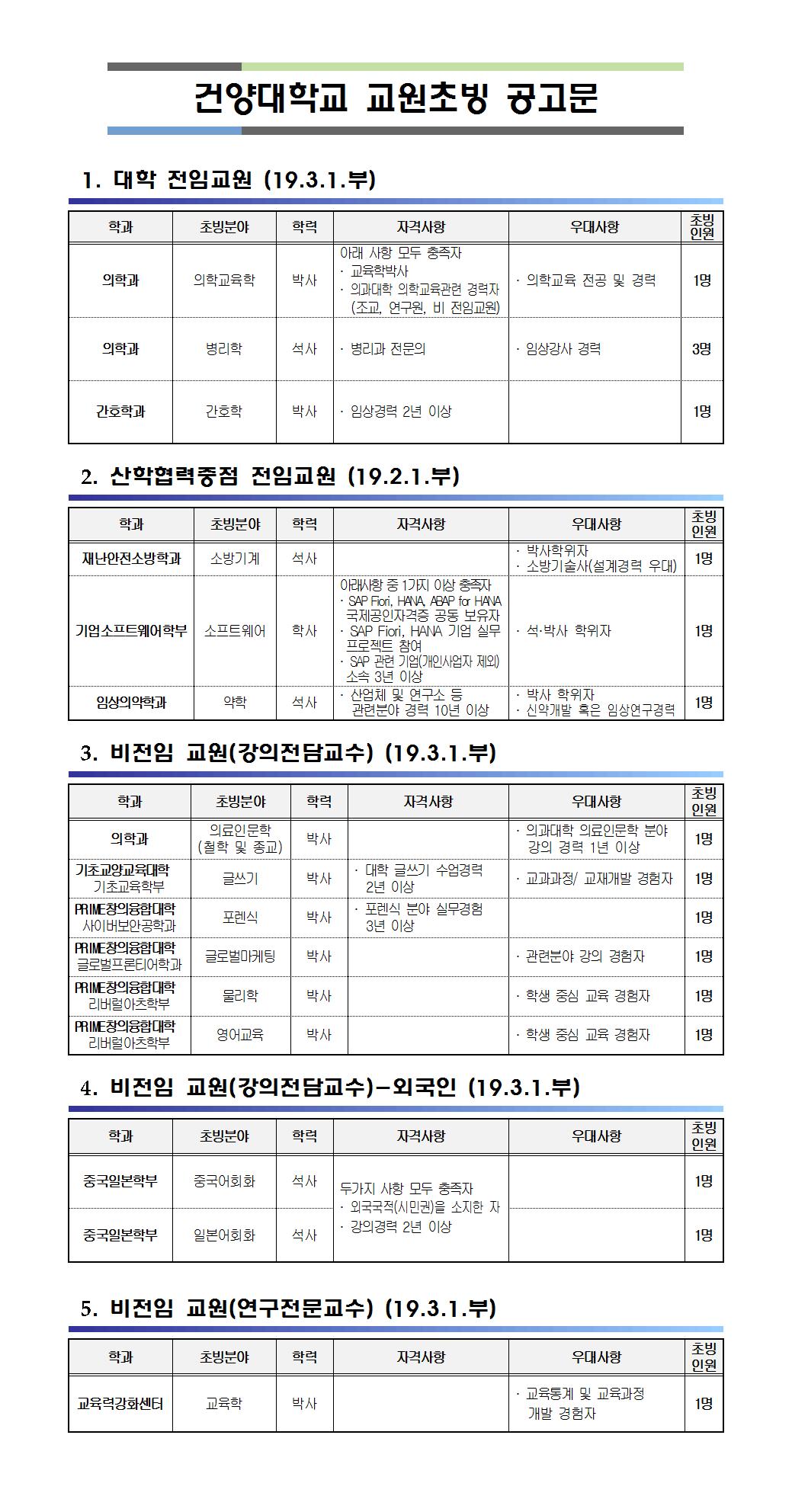 비전임교원(강의전담, 연구전문)의 경우 서류접수만 시행 ※ (붙임)2019-1학기 건양대학교 교원초빙 공고문 참조 |