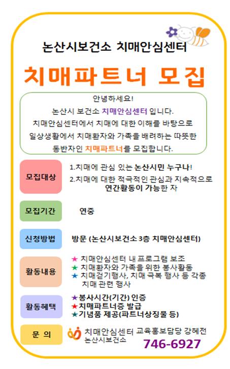 | 제목 | 논산시보건소 치매안심센터 치매파트너 모집 안내 | ||||