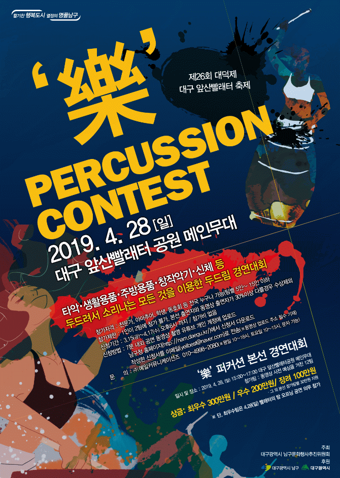 | 제목 | 대구 앞산빨래터 축제 樂퍼커션(두드림 경연대회) 참가자 모집 안내 | ||||