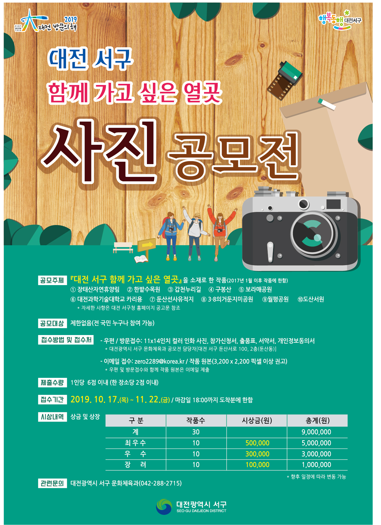 | 제목 | 대전 서구 함께 가고 싶은 열곳 사진 공모전 안내 | ||||