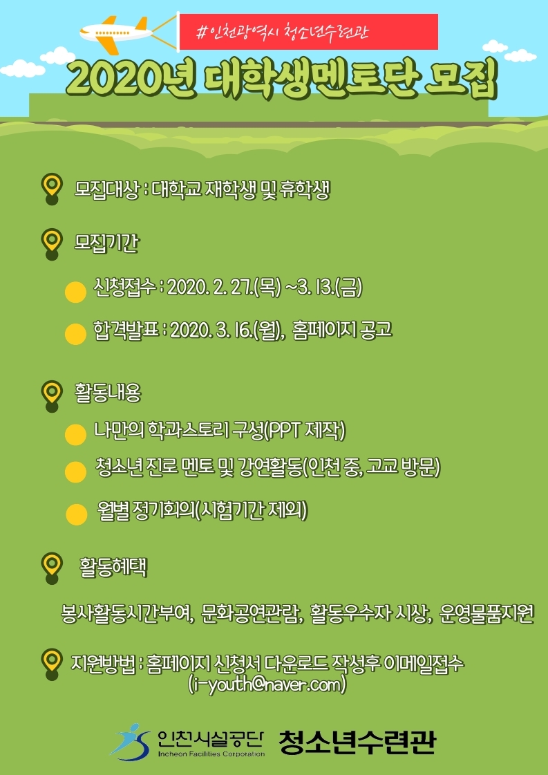 | 제목 | 2020년 인천광역시청소년수련관 대학생멘토단『동행』 모집 안내 | ||||