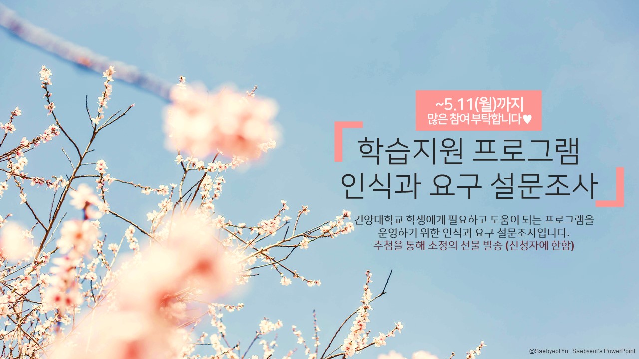 교수학습지원센터에서는 학습 지원을 위한 다양한 프로그램을 운영하고 있습니다. 보다 나은 학습지원 프로그램을 운영하기 위해 학생 여러분의 소중한 의견을 부탁드립니다. *참여대상 : 2~4학년 재학생 (추첨을 통해 선물 발송, 신청자에 한함) *온라인 설문 바로가기 : http://naver.me/5w57UKgJ